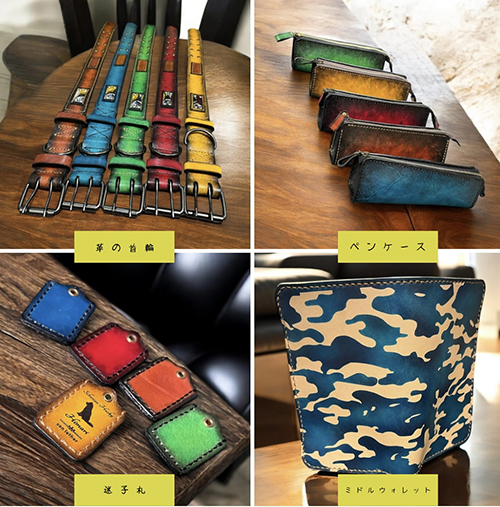 手染めで染めた本牛革に、レーザー彫刻して名入れやロゴを彫刻し、世界に一つだけの商品を提供致します
