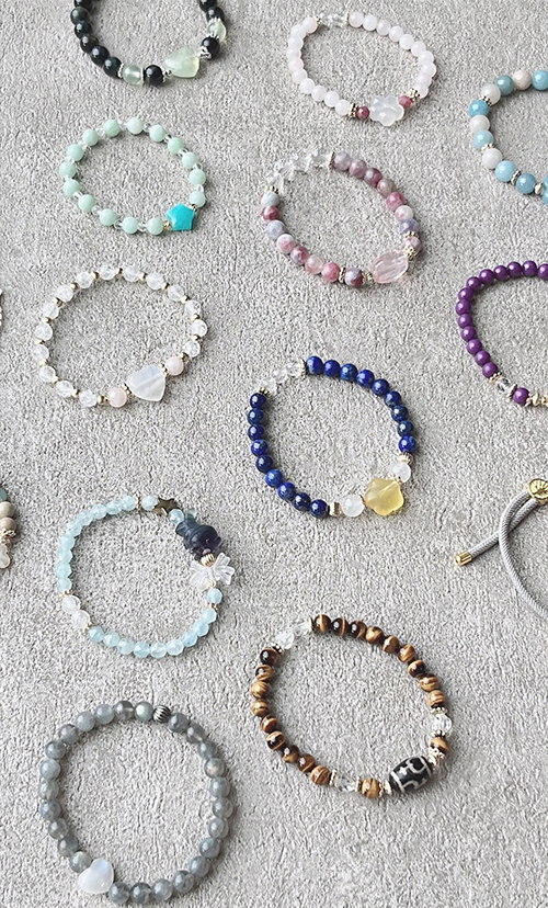 星やハートなど様々な形にカットされた天然石と小粒な石を使って、日常使いしやすい天然石ブレスレットをメインに、様々なアクセサリーを作っています