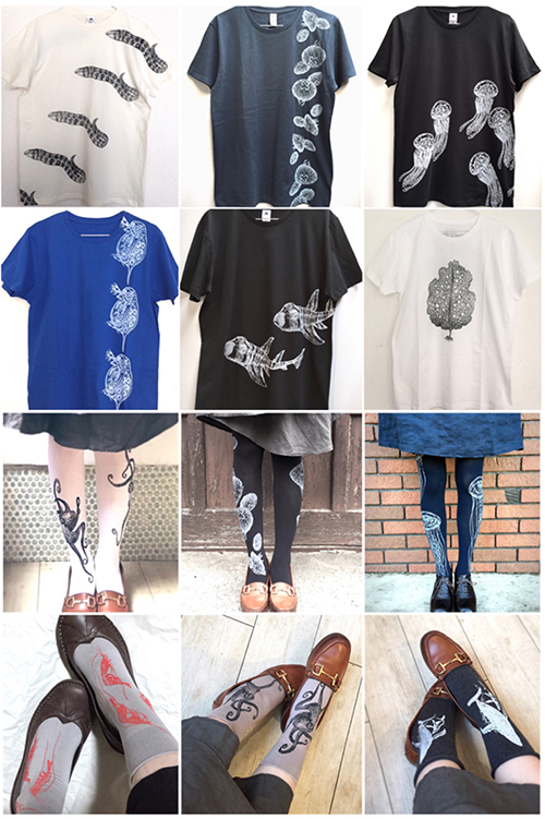 ガリ版印刷という技法で海洋生物メインにイキモノの柄を印刷したTシャツ、タイツ、靴下など製作しています。