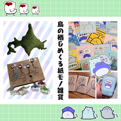 「鳥の栖」の北海道や鳥の骨グッズ、でっかいどうぬいぐるみ、「めくる紙モノ雑貨」のずうずうしいどうぶつたちの楽しいグッズがたくさんあります!