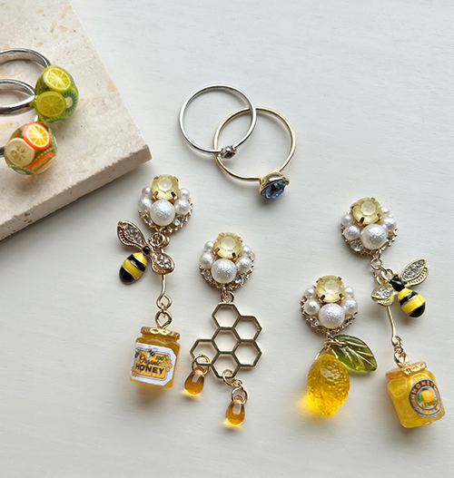ミツバチのデザインを中心に、自然をモチーフにした色とりどりのアクセサリー。季節に合わせてお楽しみください!