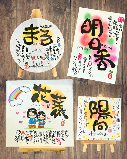 みなさんの大切なお名前を心温まるメッセージにして、味のある筆文字で彩り豊かに書き上げています! お誕生祝いや感謝を伝える贈り物にもぜひどうぞ♪