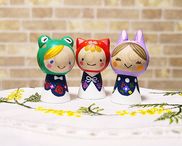 こけしとマトリョーシカのハーフ「こけリョーシカ」を作っています。手描きの模様を楽しんでいただきたいです。