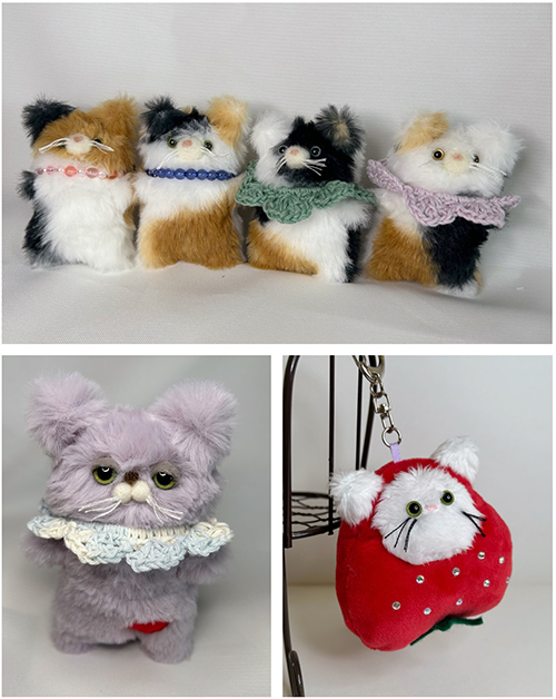 猫や犬のゆるい表情のふわふわマスコットを販売。手縫いなのでひとつずつ表情が違います。眠たげなお顔が人気です。