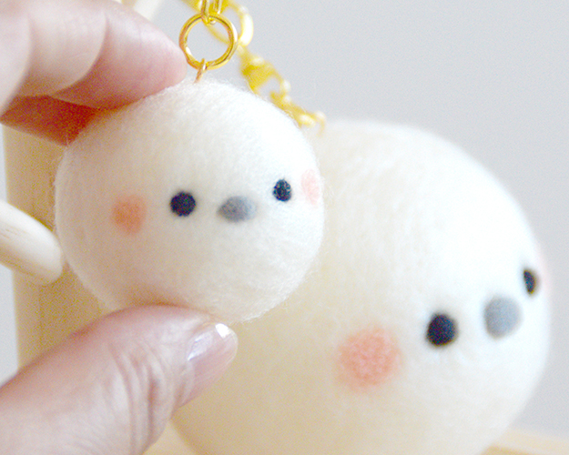 羊毛フェルトを体験できます。シマエナガやだるまなどのお顔付けや、おにぎりの模様付け体験をご用意しています。cocha作品の販売もあります。
