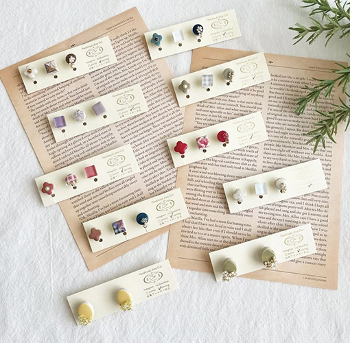主に美濃焼タイルを使用し、タイルの風合いを活かしたりビーズ等で加工したりと、普段使いから特別な日まで身に付けられるデザインに仕上げています。