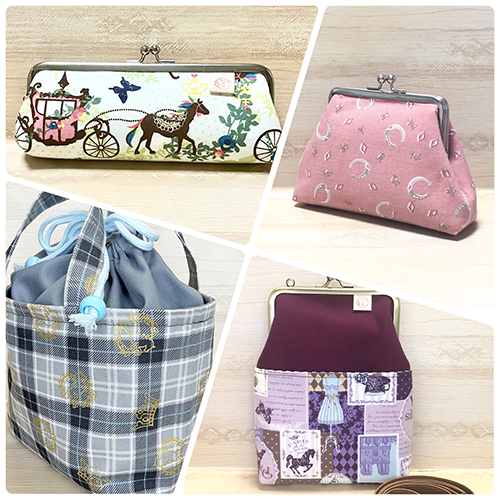 和柄生地や馬を多めに動物柄生地を用いて、がま口を中心にスマホポシェット・バッグ・ガーゼハンカチなど布小物を作っています。