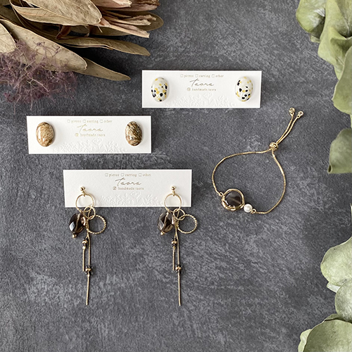 シンプルなものから個性的なものまで幅広いデザインのアクセサリーを制作しております! その場でアレルギー対応の金具へ変更も可能です!