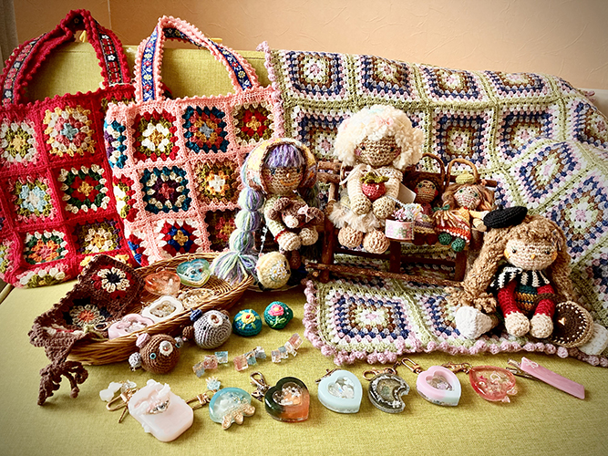 編みぐるみドールや、グラニースクエアのバッグ類、レジンのストラップetsなどのショップです♪