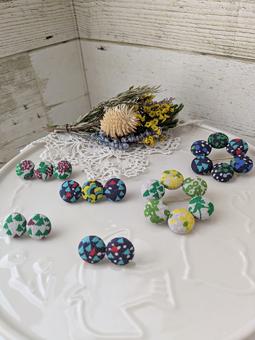 くるみボタンを使ったピアス、イヤリング、ブローチなどのアクセサリーを販売。布でくるみボタンを一つひとつ手作りしています。