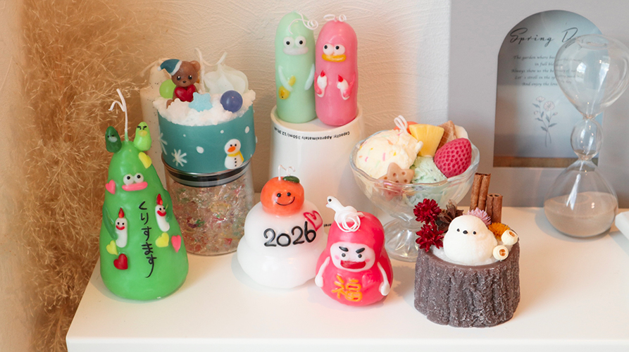 すくってデコれるアイスクリームキャンドルや、チネリでデザイン自由でアートなキャンドル、ぷにぷにキラキラキャンドルもご用意!