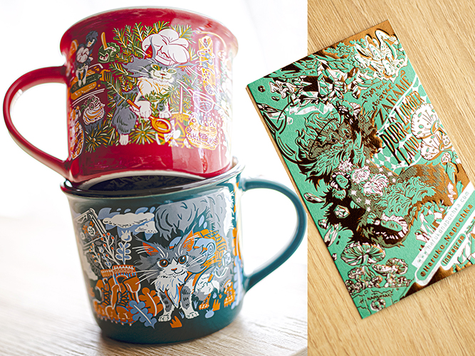 素焼きから釉薬漬け、絵付けまで1年半かけて完成した「猫の物語マグカップ」 と初チャレンジしてみた手作り「活版印刷/箔押し」グッズも販売予定。