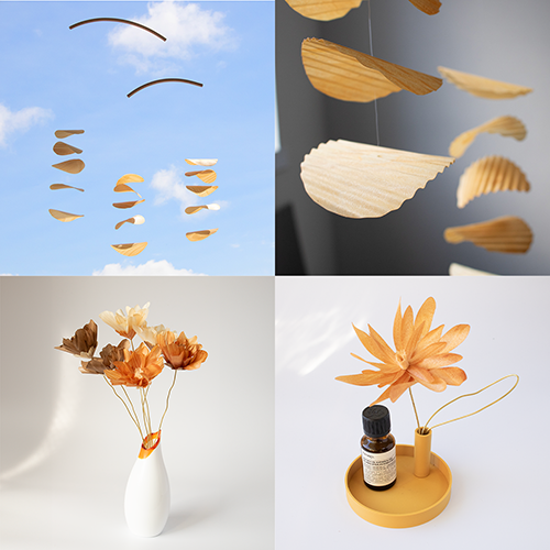 木のポテチのモビールやアロマを垂らせる木のお花など他に無いようなオリジナルインテリアプロダクトを販売しています。