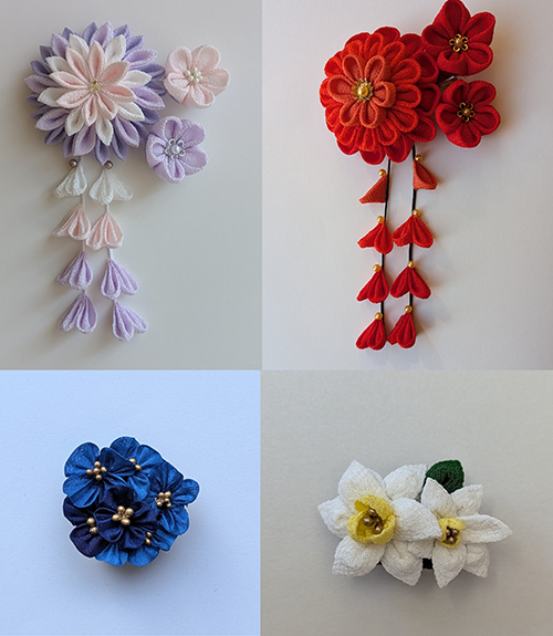 つまみ細工で細工した風鈴や装いを彩る髪飾り、季節の様々なお花をモチーフにした帯留をつまみ細工で制作、販売しています。
