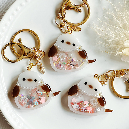 UVレジンを用いてシャカシャカキーホルダーのシマエナガちゃんは当店の1番の人気ものです!シマエナガちゃんシリーズの仲間たちも登場です!