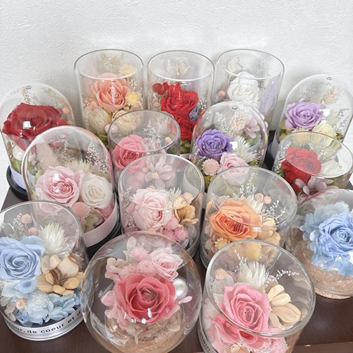 ガラスボトルに入ったアレンジメントなので、お手入れはガラスをサッと一拭きするだけ!ご自宅用にもプチギフトにもピッタリ!ドームタイプもあります!