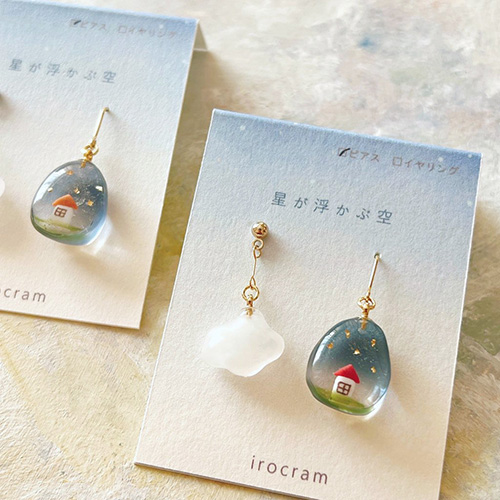 パーツをつくり、レジンや粘土でアクセサリーを製作。季節や空、色をテーマにした作品を展開。