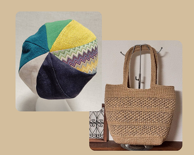 「かぶりやすさ」を追求したデザイン帽子と麻ひもで編んだほっこりバッグです♪