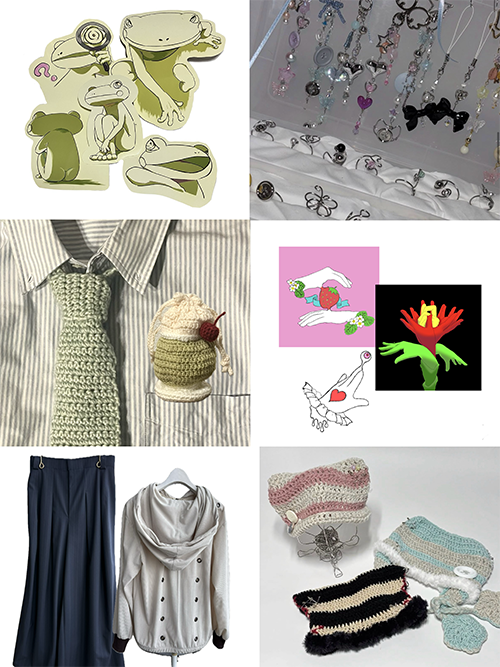 5人それぞれが、今つくりたいと思ったものを制作しています。 編み物・ステッカー・服など、自由な作品が並びます。