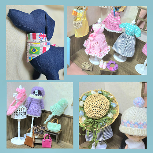 6分の1サイズを中心にドール服、ドール小物、ハウス等ドール用品の他に、小型犬の服、小物も作っています。ハウスは撮影背景にもご利用できます