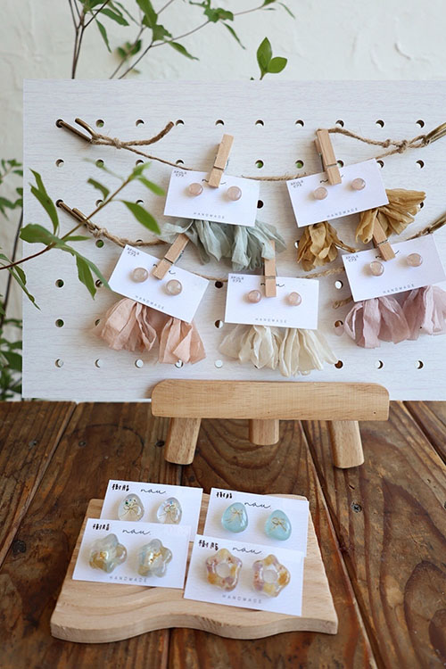 透明感のあるレジンピアス〇。天然石、シェル、真珠などが埋め込んでいるピアスを販売しています。