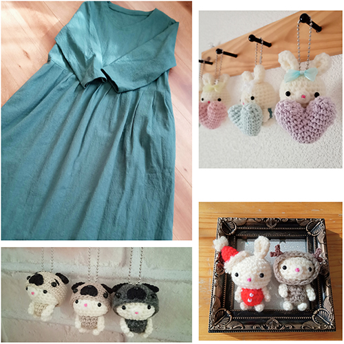 ネコやイヌを被った愛らしい表情のオリジナルあみぐるみと、シンプルでナチュラルなおとな服です