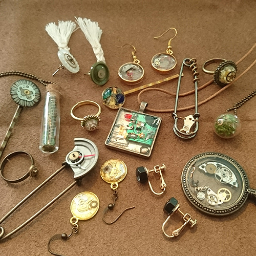 歯車をメインに再生をテーマにしたアクセサリーと布もの