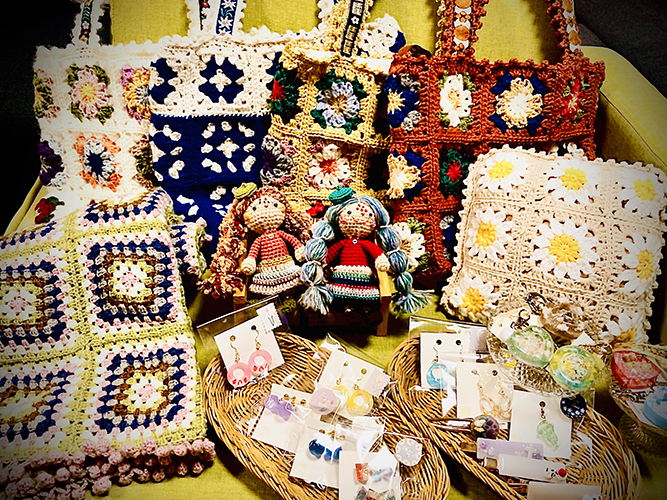 グラニースクエアモチーフを繋げたニット小物、ニットドール、レジン雑貨など。。