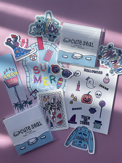 オリジナルイラストを使ったポストカード、ステッカーやメモ帳を中心に作品を制作しています。