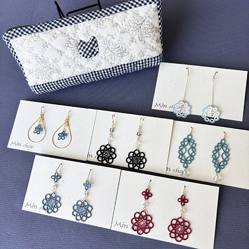 タティングレースのアクセサリー、パッチワークキルトのポーチとバッグ
