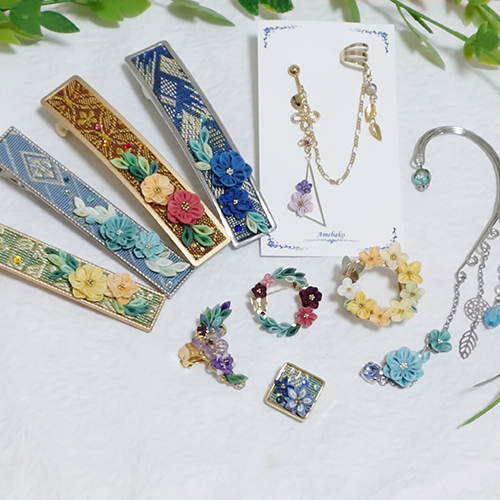 畳縁と小さなつまみ細工で彩る小さなアクセサリー達。さりげなく日常につまみ細工を♪