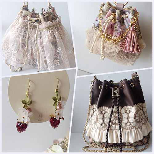 インド刺繍リボンやツイード生地で作成した巾着ポシェットやがま口ポシェット、本物のお花を使ったレジンアクセサリーを作成しています。