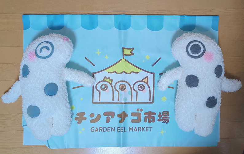 オリジナルキャラクター「チンアナゴ人」の雑貨を販売しています。チンアナゴ人はおかげさまで10周年。今年のテーマ「温泉」グッズを増やしました。