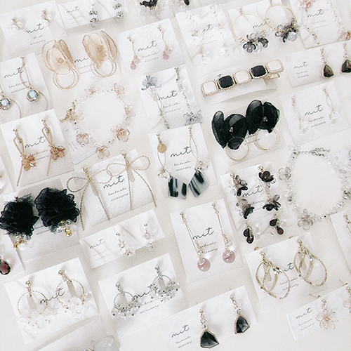 手染めビーズを使用した作品やカジュアルからキレイめまでいろいろなデザインのアクセサリーをお選びいただけます♪