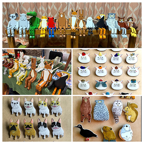 鳥や動物、クスッと笑えるデザインのブローチやピアス、ポーチ&誰でも演奏できる、アイルランド発祥の踊る木製人形楽器リンバージャックを製作販売