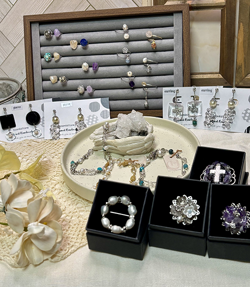 出店は2回目になります。天然石や様々なパーツを想いのままに繋げました。貴方らしいアイテムをぜひ手に取って見て下さいね。