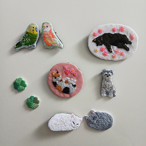犬、猫など動物、食べ物、花など色々な刺繍ブローチを販売します