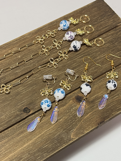 アジアンテイストの耳飾りやブレスレット等アクセサリーを置いています。洋装和装どちらでも是非合わせてみてください。