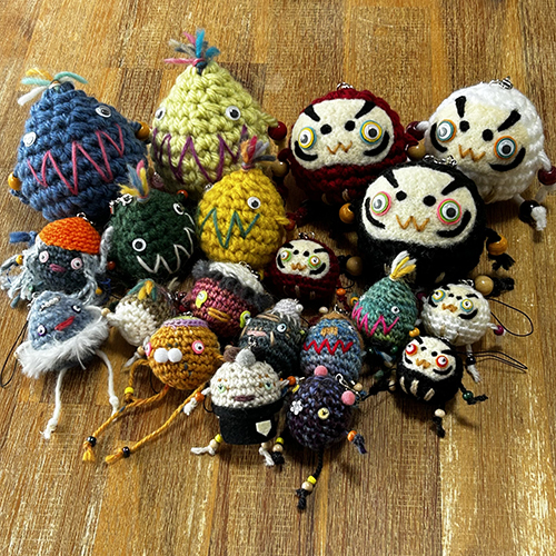 あみぐるみ「キモ一族」ストラップに加えブローチタイプも増えました。レザーのカードケースに新色も登場です。