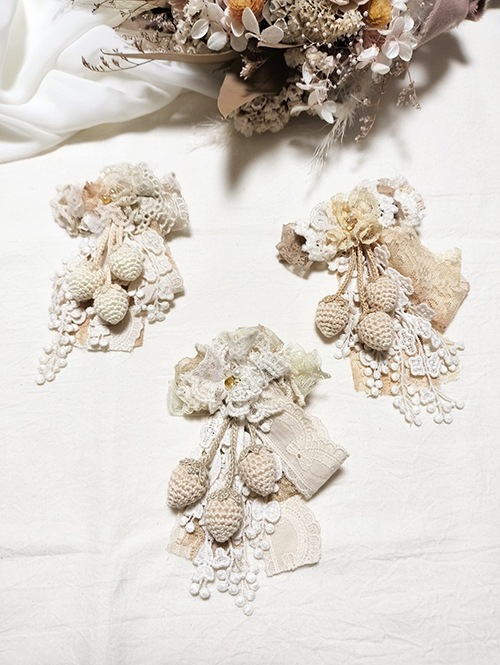 淡色レースと編みモチーフを合わせて作る小物や雑貨、ヘアアクセサリーなどを販売しています。 中でも写真にあるレースベリーが一番人気の作品です。