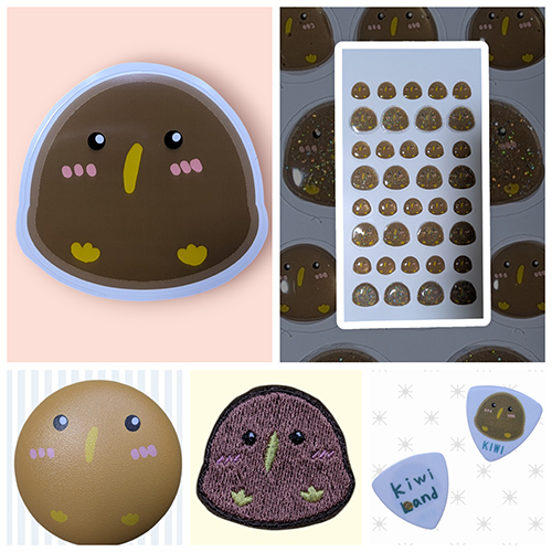 キーウィのステッカー、ぷにぷに缶バッチ、刺繍ワッペンなどを販売します。他にも文房具を中心に制作しています。