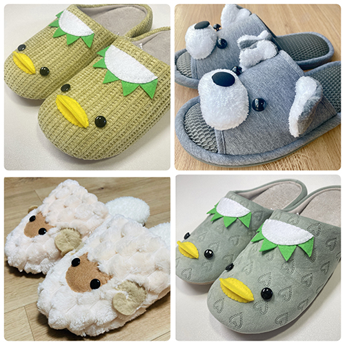 まるでぬいぐるみのようなスリッパ。フェルトや布で作ったどうぶつの顔のパーツを既製スリッパに丁寧にパーツを縫い付け作製しています