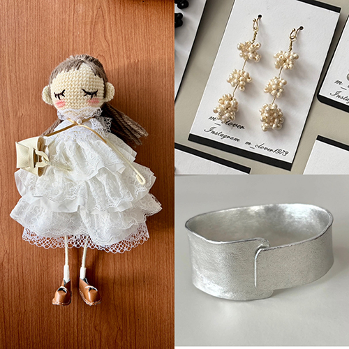 編みぐるみの女の子、錫やビーズのアクセサリーを販売しています