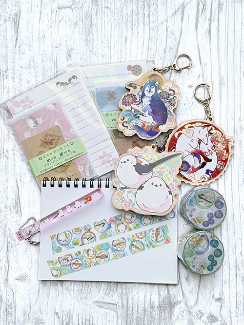 シマエナガ、雀、狼、狐、狸などの動物イラストの雑貨やステーショナリー、原画の展示など