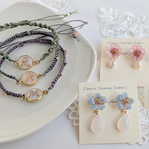 ワイヤーで花びらから作ったお花のアクセサリーを中心に、イニシャルモチーフのアクセサリー、ラミネート生地で作ったペンケースなどの布小物も販売。