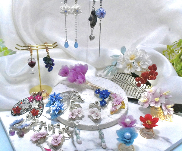 絹で仕立てたつまみ細工のアクセサリーです。絹の静かな輝きと丁寧な手仕事で、大人の日常に上質な華やぎを添えられるアクセサリーを制作しています。