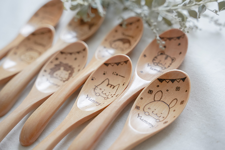 ウッドバーニングでひとつひとつ手書きしています。当日はその場で名入れも!