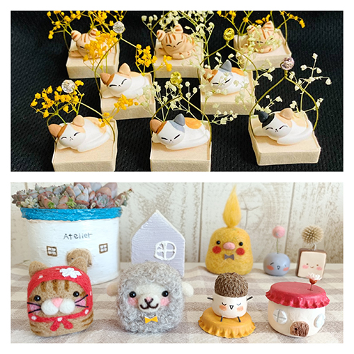 toco*toco→羊毛フェルト、木工、粘土、多肉植物 pleasure arts→樹脂粘土、ポンポン動物 など2人の小さなかわいい物達が並びます