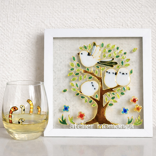 ステンドグラスの様に透ける絵の具でかわいい動物たちを描いています