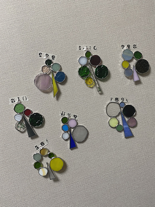 ガラスの個性を組み合わせた作品です。同じモノは作れず一点モノばかり。触って光に透かして選んでね。5つの円がご縁となり繋がっていきます。